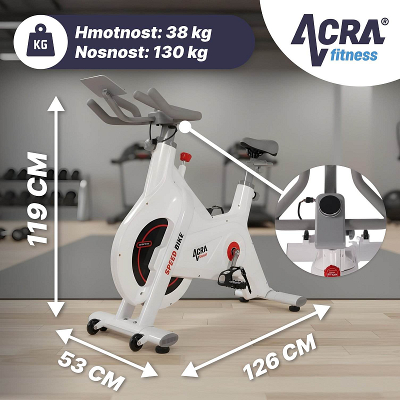Proč si vybrat Acra BC8705? Přizpůsobitelný trénink: Mechanický systém nastavení zátěže vám umožňuje snadno upravit intenzitu cvičení podle vašich individuálních potřeb a cílů. Setrvačník 6kg: Lehčí setrvačník se snáze roztočí a zpomalí, čímž zajišťuje plynulý chod a realistický pocit z jízdy, jako byste jeli venku na kole. To je ideální pro začátečníky a jezdce, kteří preferují komfortní a tichý trénink. Maximální komfort: Nastavitelná poloha sedla a řídítek vám umožňuje najít optimální pozici pro cvičení a minimalizovat únavu, čímž je ideální pro ženy a jezdce s menší postavou. Tichý a hladký chod: Pohon s gumovým řemenem zajišťuje tichý a hladký chod, takže nerušíte sousedy ani členy domácnosti. Přesné sledování tréninku: LED knoflíková konzole s Bluethooth sleduje a zobrazuje klíčové tréninkové parametry, jako je čas, ujetá vzdálenost, spálené kalorie, rychlost, tepová frekvence a výkon (watt). Praktický držák na tablet nebo mobil: Sledujte před sebou to, co potřebujete, ať už alikaci na sledování výkonu, film nebo cokoli, co ve vás vyvolá vysoký výkon. Manipulace: Váha 38 kg a transportní kolečka zajišťují dobrou přenositelnost, takže ho po cvičení snadno uklidíte. Kompatibilní s aplikacemi: Možnost připojení přes Bluetooth na oblíbené aplikace, jako je Zwift a Kinomap pro…
