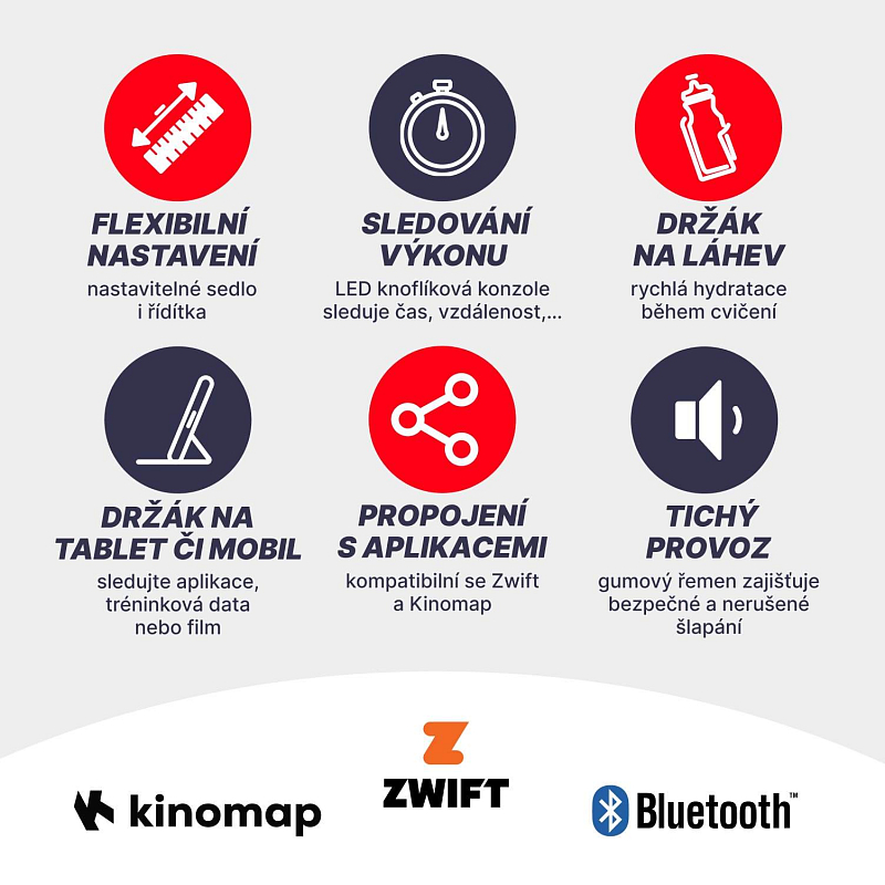 - Kompatibilní s aplikacemi: Možnost připojení přes Bluetooth na oblíbené aplikace, jako je Zwift a Kinomap pro zábavnější a interaktivnější trénink.