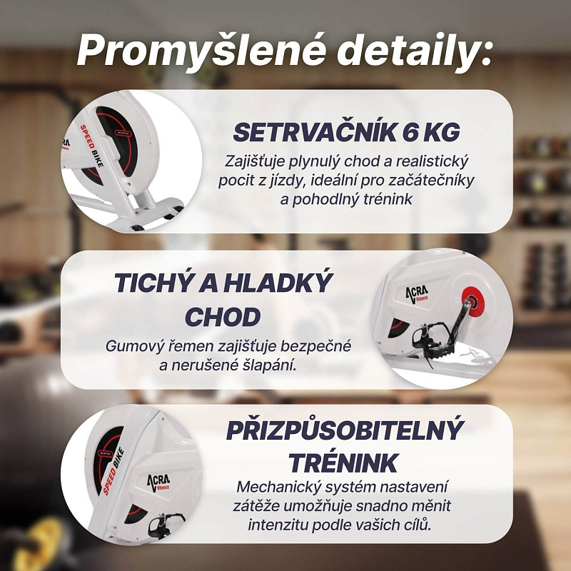 - Setrvačník 6kg: Lehčí setrvačník se snáze roztočí a zpomalí, čímž zajišťuje plynulý chod a realistický pocit z jízdy, jako byste jeli venku na kole. To je ideální pro začátečníky a jezdce, kteří preferují komfortní a tichý trénink.