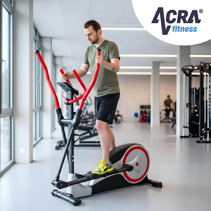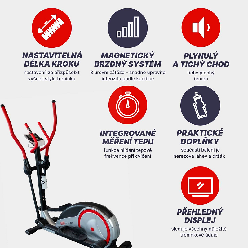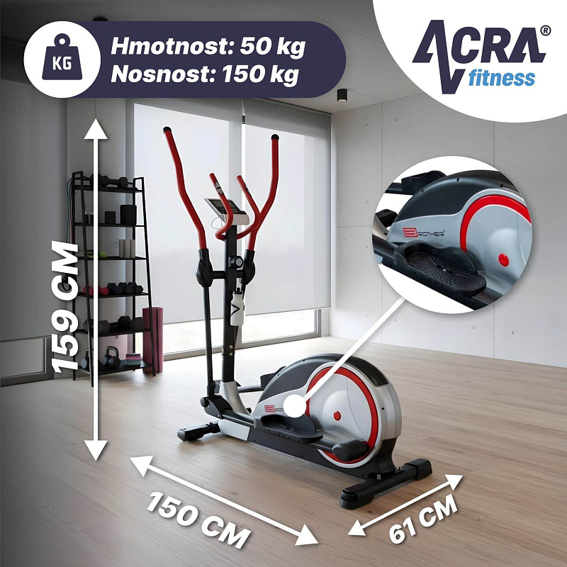 Magnetický eliptical BE91, je robustní posilovací stroj s následujícími parametry: magnetická brzda s osmi stupni zátěže váha setrvačníkového kola 9 kg středová osa třikrát uložená na velmi kvalitních kuličkových ložiskách převod plochým řemenem umožňuje umístění v místnosti, protože eliptical má velmi tichý chod nastavitelná délka kroku 36 - 42cm, rozpětí mezi lyžinami je 17,5 cm funkce computeru: SCAN - opakované postupné zobrazování všech měřených údajů, ČAS, VZDÁLENOST, KALORIE, HAND PULSE, RYCHLOST, Body fat, Test fyzické kondice (RECOVERY), Funkce hlídání tepové frekvence při cvičení (HRT). doporučeno pro výšku postavy do 200 cm při zachování maximální povolené hmotnosti rozměr: 140 x 57 x 160 cm, hmotnost: 50 kg, nosnost: 150 kg, velikost balení 133x42x58 cm lahev na pití + držák je součástí výrobku. Při objednání je k elipticalu účtované dopravné 250,- Kč s DPH z důvodu objednání speciálního svozu. Dodavatel: ACRA s.r.o., Brodská 161, Semily, 51301, 420481389087, obchod@acra.cz