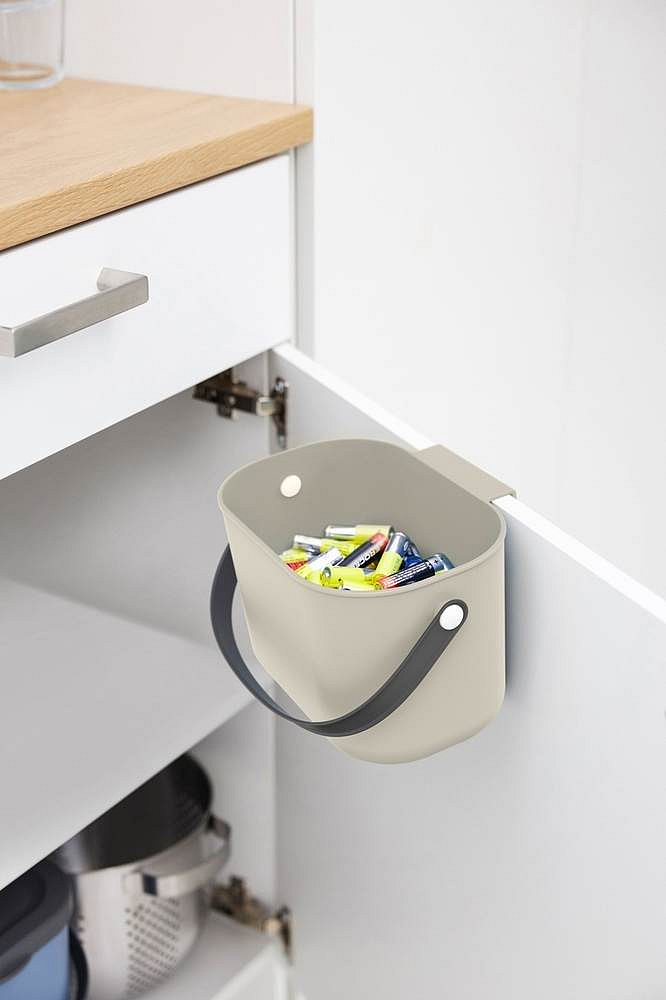 ALBULA 3,2L závěsný koš. Koš je dokonalým kuchyňským pomocníkem pro pohodlný a snadný sběr organického odpadu, kávových kapslí nebo tablet na mytí nádobí. Lze umístit na pracovní desku nebo zavěsit na dvířka a zásuvky v kuchyni pomocí závěsného zařízení. Pohodlná rukojeť pro snadné přenášení. Moderní design. Kvalitní provedení od švýcarské značky Rotho.