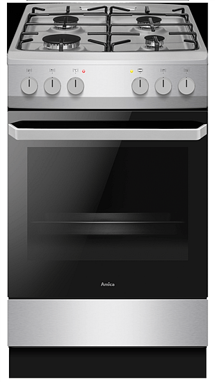 Plynová varná deska, 4 zóny, Elektrická trouba, 4 funkce trouby, Objem 67 l, Lehce čistitelný smalt uvnitř trouby, Bezpečnostní pojistky hořáků, Trysky na propan butan součástí balení, Počet skel dveří trouby 3, Rošt 1x, Energetická třída A, rozměry v x š x h 85x50x60cm, Stříbrná