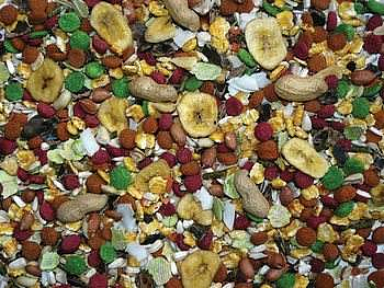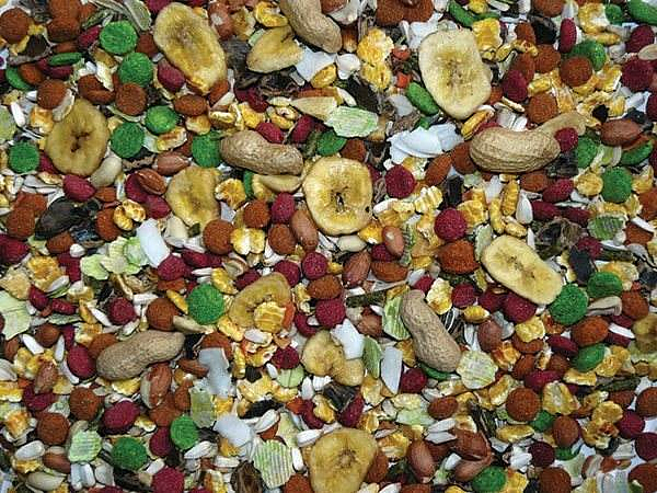 Výběrová krmná směs obohacená o spoustu oříšků, ovoce a zeleniny.