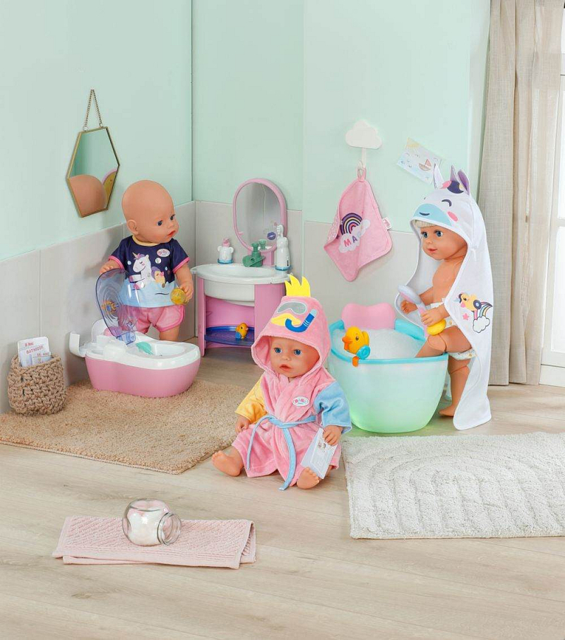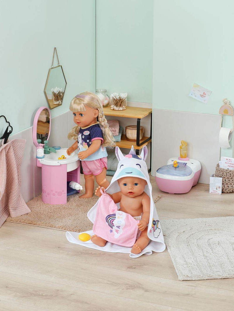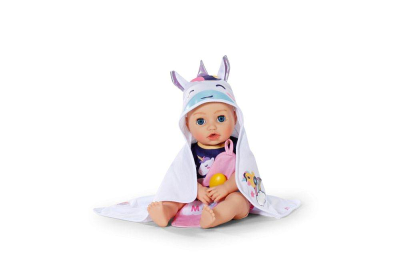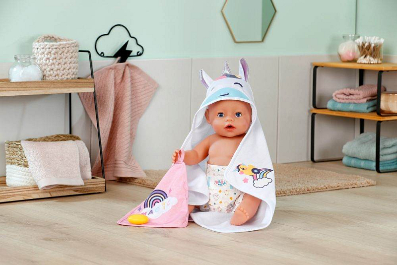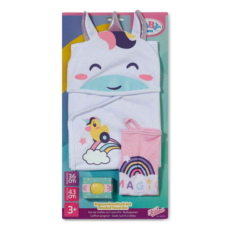 BABY born Sada ručníků s jednorožcem a duhou. • Dva ručníky s motivem jednorožce a duhy • Kapuce s potiskem jednorožce, duhovým rohem a roztomilými oušky • Měkký materiál: zajišťuje příjemný pocit po koupeli • Pro panenky velikosti 36 cm a 43 cm