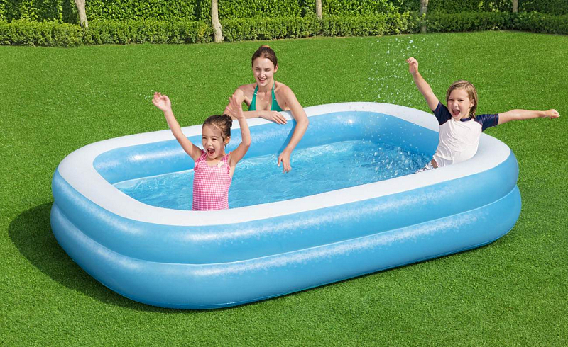 Obdélníkový nafukovací bazén střední Family dvoukomorový, modré stěny, dno a vrchní pruh je v bílé barvě rozměr: 269 x 175 x 51 cm ( rozměry výrobků jsou uvedeny ve vyfouknutém stavu ) pro děti nad 6 let kapacita vody: (75%) 982 L vhodný pro zahrady rodinných domůDodavatel: BESTWAY INTERNATIONAL LTD., 10502 N Ambassador Dr Ste 120, Kansas City, MO 64153, +1 816-891-8339, info@bestway-intl.com