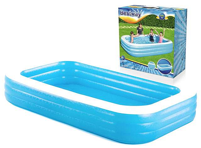 Obdélníkový nafukovací bazén střední Family tříkomorový, průhledné stěny, dno je v bílé barvě, rozměr 305 x 183 x 56 cm, pro děti nad 6 let, kapacita vody (75%)1282 L. Vhodný pro zahrady rodinných domů. Rozměry výrobků jsou uvedeny ve vyfouknutém stavu.Dodavatel: BESTWAY INTERNATIONAL LTD., 10502 N Ambassador Dr Ste 120, Kansas City, MO 64153, +1 816-891-8339, info@bestway-intl.com