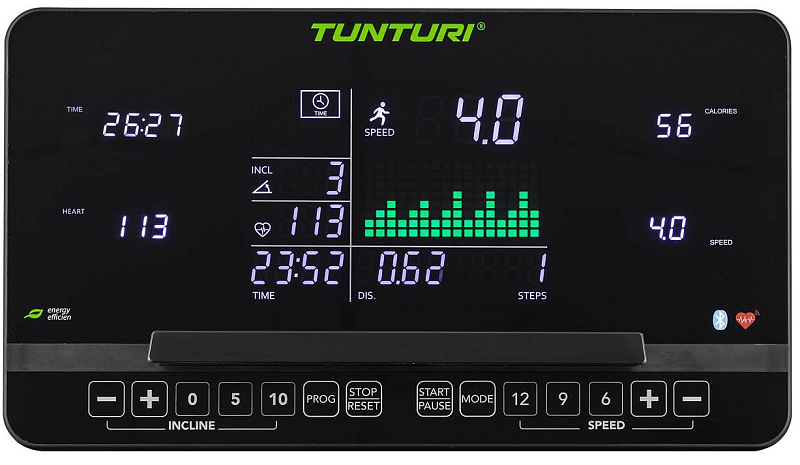 Počítač běžeckého trenažéru TUNTURI T40 Competence je vybaven podsvíceným 4 LED + LCD displejem, který zobrazuje základní hodnoty jako je čas běhu, rychlost, vzdálenost, spálené kalorie, tepovou frekvenci a sklon. Z bohaté programové nabídky je k dispozici celkem 44 programů - z toho 36 přednastavených, 3 uživatelské, režim Body Fat a další. Běžecký pás TUNTURI T40 Competence je vybaven praktickým držákem na tablet/smartphone a Bluetooth zařízením.