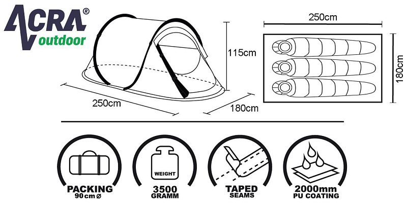 STAN SAMOSTAVĚCÍ pro 3 osoby. Jedná se o velmi skladný a jednoduše postavitelný stan. Navléknuté sklolaminátové pruty po vyndání z obalu stan kompletně postaví. Pak už jen stačí stan upevnit kolíky k zemi a dopnout plášť stanu kotvícími šňůrami kolem dokola. jednoplášťový tunel s předním vchodem opatřeným moskytiérou poměrně komfortní rozměry stanu pro příjemné používání pro 3 osoby s dostatkem vnitřního prostoru – rozměry stanu jsou 250 x180 x115 cm hmotnost stanu je 3,5 kg postavení stanu trvá maximálně 5 minut i s upevněním na kolíky a kotvící šňůry impregnace stanu včetně podlepených švů je 1500 mm vodního sloupce na plášti, 3000 mm PE podlážka Samostavěcí stan má zpevněné a podlepené švy, které brání proniknutí vody, impregnace je 1500 mm vodního sloupce, hmotnost stanu je 3,5 kg. Sbalený stan zabere minimum prostoru. Stan stačí vyndat z obalu, hodit na zem a on se sám postaví díky pružným sklolaminátovým nosným prutům. U stanu je přibalené návod s postupen na skládání a rozkládaní stanu. Rozměr pro přepravu 90 x 90 x 3 cm. Demontáž je dobré provádět podle návodu, aby nedošlo k polámání sklolaminátových průtů. Dodavatel: ACRA s.r.o., Brodská 161, Semily, 51301, 420481389087, obchod@acra.cz