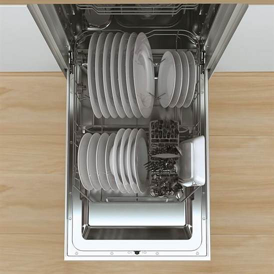 myčka plně integrovaná, šíře 45 cm, 9 jídelních souprav, 2 koše, LED ukazatele, LED kontrolky, Silent Plus - tichý chod - hlučnost 49 dB(A), A+, bílá. Rozměry výrobku v x š x h 82 x 44,5 x 54 cm
