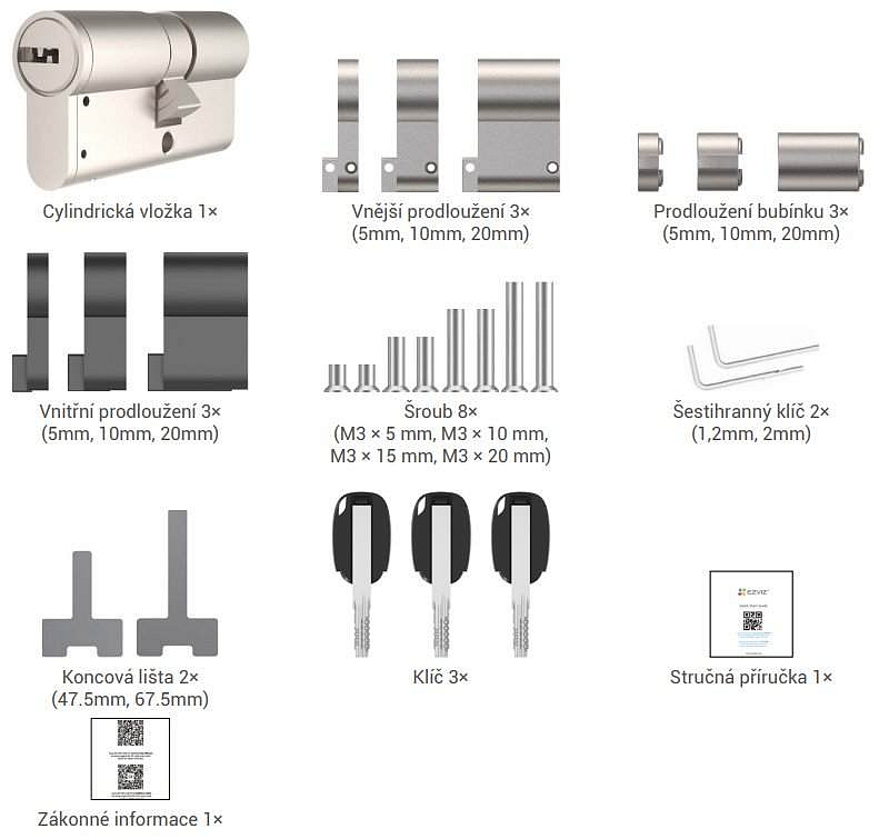 Cylindrická vložka s prostupovou spojkou je kompatibilní s chytrým zámkem EZVIZ DL01S. Modulární řešení s nastavitelnou délkou lze přizpůsobit většině dveří, díky až 16 možným rozměrům cylindrické vložky. Odolná konstrukce s mosazným tělem a nástavci ze zinkové slitiny zabraňuje násilnému otevření. Součástí balení jsou 3 klíče.