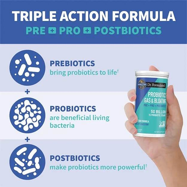 Jedná se o cílenou formuli s trojím účinkem pro ty, kteří občas trpí zažívacími problémy. Dr. Formulated Probiotics Gas & Bloating je speciální, protože obsahuje nejen 50 miliard CFU a 15 různých kmenů probiotik v jedné kapslii, ale také poskytuje prebiotickou směs na podporu růstu dobrých bakterií – podporu přirozeně zdravého mikrobiomu. Klinicky studovaný kmen B. lactis HN019 zmírňuje občasnou plynatost, nadýmání, vhodně působí při zácpě a průjmu. Probiotika Dr. Formulated Probiotics Gas and Bloating, obsahuje také exkluzivní postbiotickou směs na podporu růstu bifidobakterií. Získáte každodenní podporu pro správnou funkci trávicího traktu s trojitým účinkem – to vše v jedné, snadno polykatelné kapsli denně!