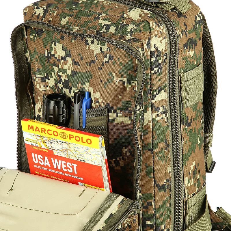 Model Defender má celkem 4 komory o celkovém objemu 30 litrů. Všechny komory jsou opatřeny dvoucestným zipem. Hlavní komora má zip po téměř celém obvodu a je možné ji zcela otevřít pro pohodlný přístup, víko komory je opatřeno síťovinovou kapsou, do které se vejde například tablet. Prostřední komora obsahuje hlavní prostor například pro dokumenty a mapu, na stěně komory jsou dále 2 kapsy například pro tužky, propisky, buzolu nebo svítilnu. Přední, horní komora je určena na menší předměty jako je například powerbanka, nebo mobilní telefon. Přední dolní komora nabízí krom hlavního prostoru také další řadu kapsiček na drobnosti. Na zadní straně se nachází ještě jedna plochá kapsa na suchý zip.