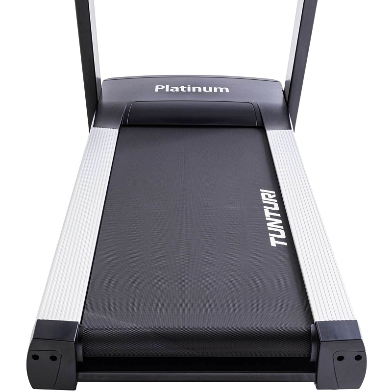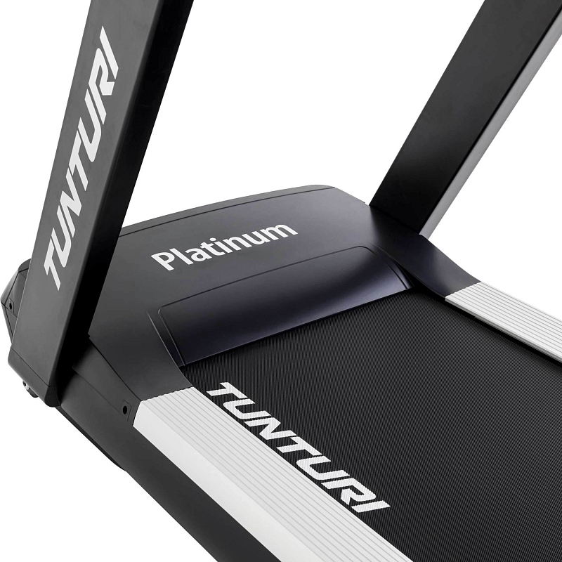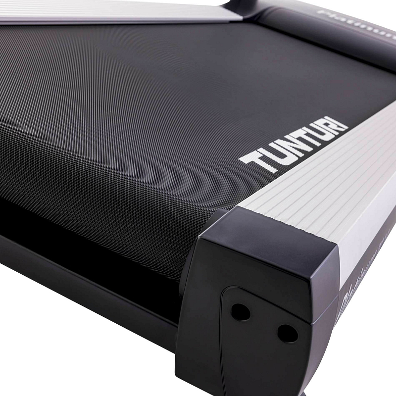 Běžecký pás Tunturi Platinum TR20 má speciální běžecký pás s diamantovou strukturou o tloušťce 2,2 mm. Tento ortopedický běžecký pás je silnější, poskytuje extra odpružení a je odolnější. Kromě toho má tento běžecký pás protiskluzovou vrstvu pro větší přilnavost a stabilitu zejména při tréninku ve vysokých rychlostech. Boční přistávací plochy na levé a pravé straně běžeckého pásu, kde si můžete při pohybu pásu opřít nohy, jsou vyrobeny z těžkého hliníku.