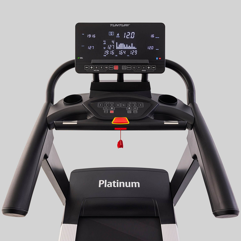 Desetipalcový displej LCD s držákem na tablet poskytuje jasný přehled o všech důležitých tréninkových parametrech, jako je čas, rychlost a tepová frekvence. Integrované snímače tepové frekvence v rukojetích zajišťují přesné měření a umožňují personalizovaný trénink podle tepové frekvence. Běžecký pás Tunturi Platinum TR20 vyniká přesným měřením vzdálenosti na deset metrů, což umožňuje ještě přesněji sledovat výsledky tréninku. Přídavný ovládací panel s rychlými tlačítky nad rukojeťmi navíc poskytuje pohodlnou možnost nastavení rychlosti a sklonu.