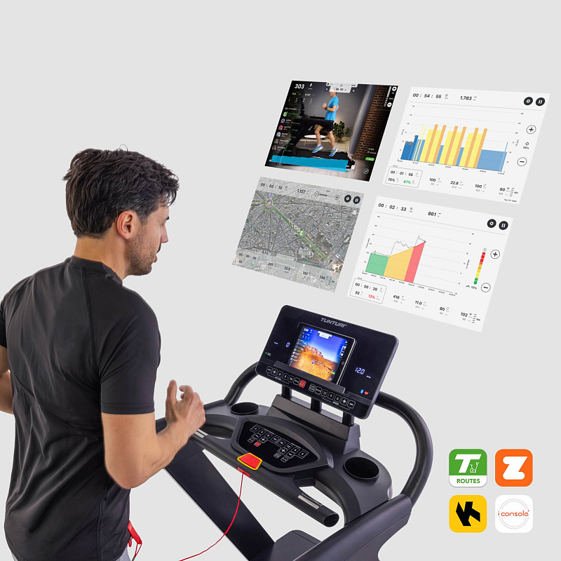 S aplikací pro videotrénink, jako je Tunturi Routes nebo Kinomaps, můžete trénovat v interiéru, jako byste byli venku. V bezplatné verzi máte přístup k řadě videotras, zatímco v placené verzi si můžete vybrat ze stovek tras po celém světě. Při spárování aplikace Zwift s běžeckým pásem Tunturi Platinum TR20 se video přizpůsobí rychlosti, kterou právě trénujete. Pokud s monitorem spárujete aplikaci iConsole+, umělá inteligence pro vás vytvoří personalizovaný program na základě vašich dosažených tréninkových výsledků.