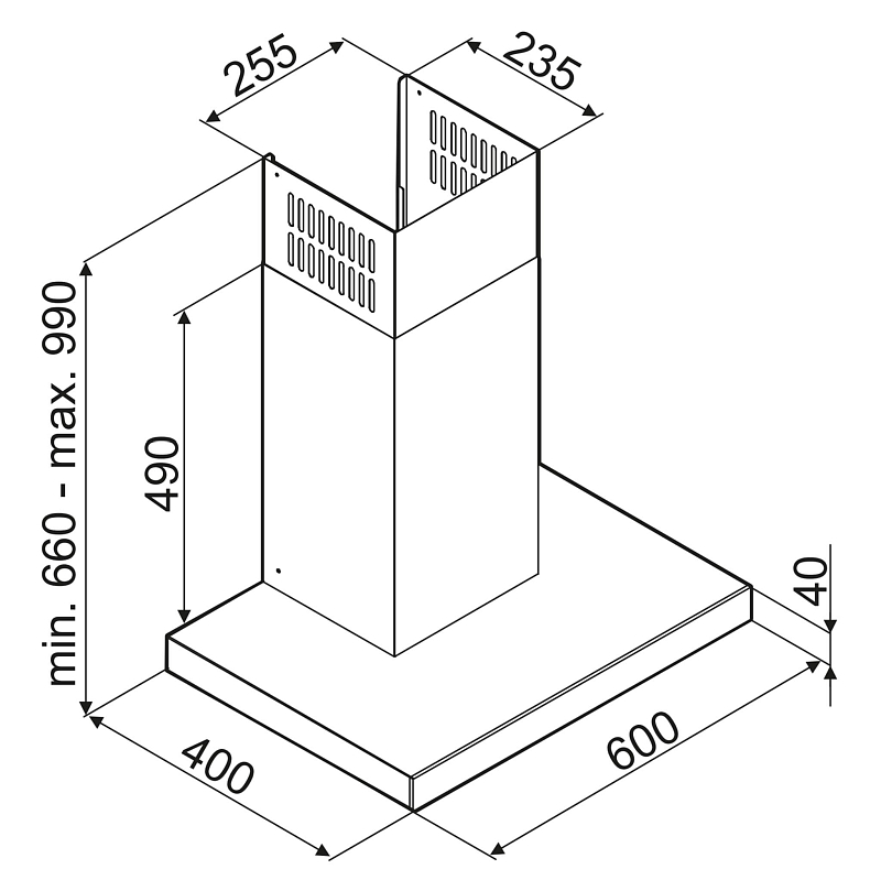 Elegantní komínový odsavač par ve tvaru T, se skleněným černým panelem  Elektronický ovládací panel s dotykovým ovládáním funkce časovač 1 motor 4 rychlosti LED osvětlení - 2x 4W energetická třída B modré LED podsvícení display 2x kovový filtr proti mastnotám umývatelný v myčce s neomezenou životností (aluminium) max. výkon 334 m3/hod TURBO výkon 481 m3/hod nízká hlučnost 41 - 57 dBA TURBO max. hlučnost 63 dBA nastavitelná výška výstup 150 mm provedení nerez a černý skleněný panel odtah nebo možné používat jako recirkulační přes uhl. filtr (kód FW-K240) - není součástí digestoře max. příkon 170 W rozměry VxHxŠ: nastavitelná výška 71 - 99 x 40 x 60 cm