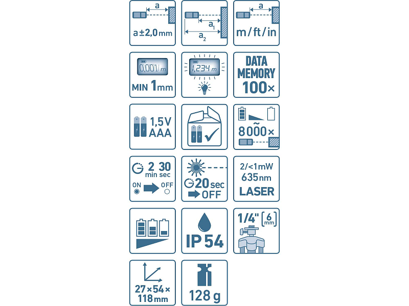 laserová technologie umožňuje měřit rychleji a také na hůře přístupných místechfunkce automatického vypnutí laseru po 20s, automatické vypnutí přístroje po 2,5min. nečinnosti chránící výdrž bateriímožnost volby měření od přední nebo zadní hrany přístrojelze instalovat na stativ se závitem 1/4"funkce automatická kalibrace - přístroj lze dle potřeby kalibrovatpřístroj disponuje krytím IP 54