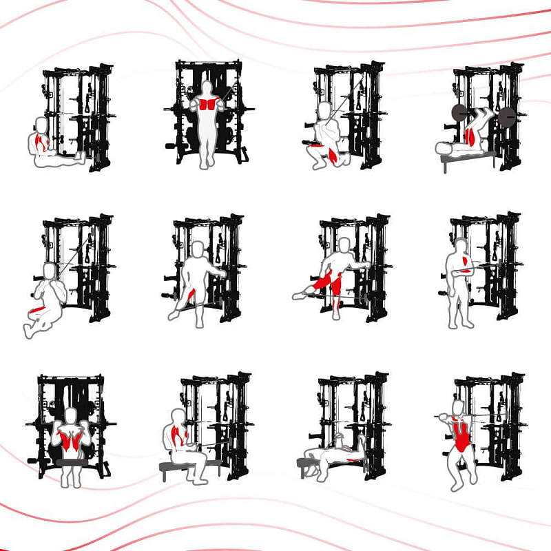Sofistikovaný, multifunkční a připraven k akci! Tento stojan typu Smith machine s cihličkovým závažím bude hvězdou každé profesionální posilovny!