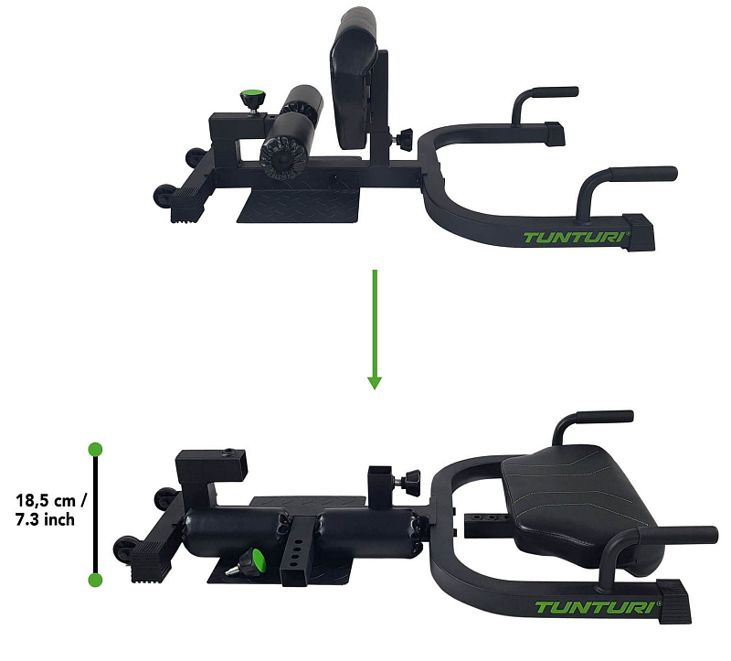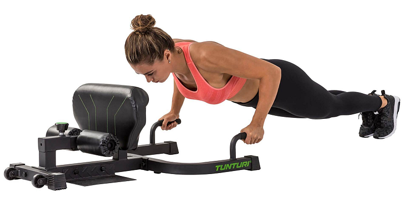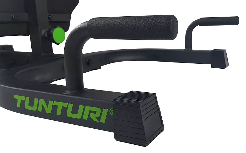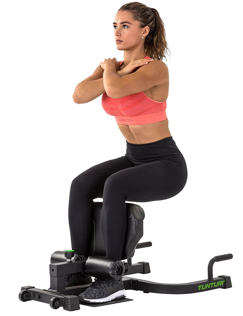 TUNTURI WT20 Sissy Squat je speciální posilovací lavice na "sissy dřep" se zaměřením na posilovaní kvadricepsů, břišních svalů tzv. sedů/lehů nebo díky úchopovým madlům na klasické kliky.