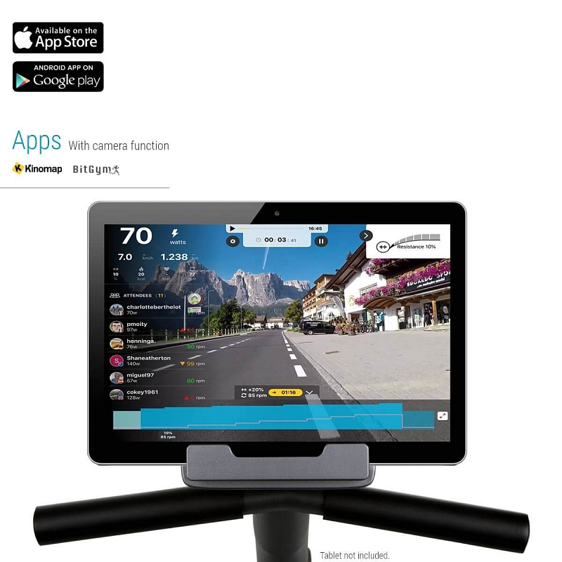 Kromě tradičního zobrazení na počítači máte také možnost zažít vzrušující živé trasy prostřednictvím aplikace. Tréninková aplikace BitGym přináší video záznam vaší preferované trasy do vašeho smartphonu nebo tabletu. Čím tvrději šlapete, tím rychleji projíždíte lesem nebo po nábřeží. Jednoduše položte svůj mobil na držák smartphonu/tabletu a užijte si tuto nejmodernější tréninkovou motivaci.