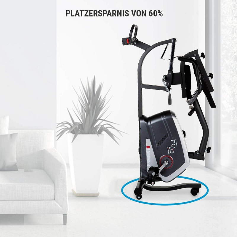 Doma je často málo místa. Horizontální rotoped HAMMER Clever Fold RC5 je dokonalým trenažérem především pro malé prostory. Pomocí tří jednoduchých kroků stroj složíte, zvednete (rozměry po složení: 61 x 62 x 95 cm) a díky transportním kolečkům pohodlně přesunete do rohu místnosti nebo postavíte vedle šatníku. Integrovaný přepravní kolečkový systém zajistí otočení na místě o 360 stupňů, což znamená, že HAMMER RC5 lze snadno přesunout do rohu, za dveře nebo vedle skříně stejně jako kufr, aniž by se zachytil v jakýchkoliv rozích. Maximální stabilitu vám zajistí vyrovnávače nerovnosti podlahy.