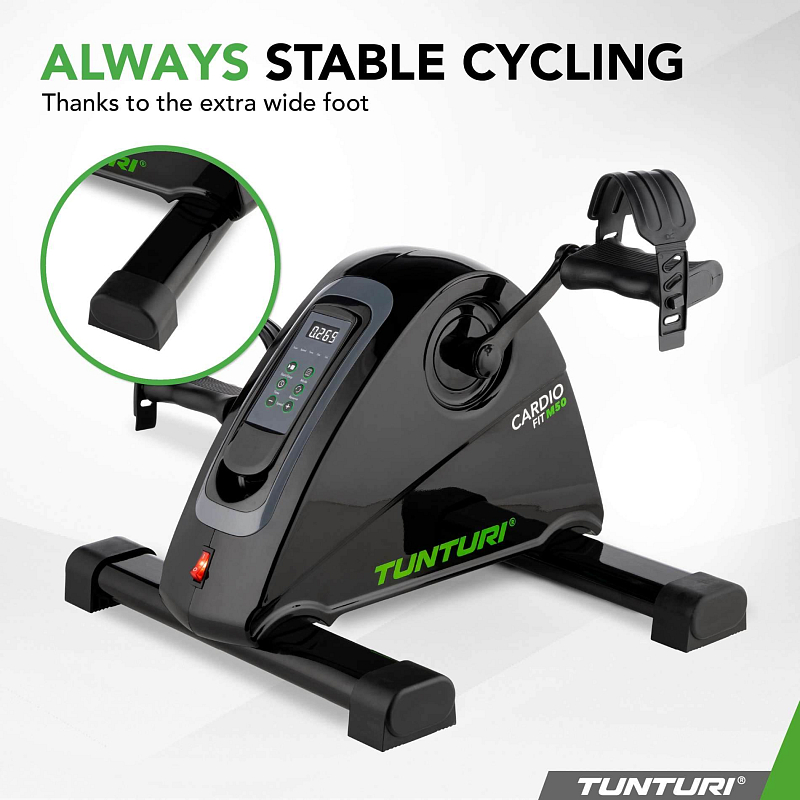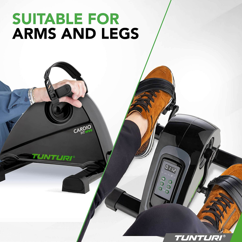 Rotoped Tunturi Cardio Fit M50 Minibike Motorized Vyzkoušejte vylepšený minibike Cardio Fit M50 s extra širokými protiskluzovými nožičkami.Pokud jste starší nebo méně pohybliví, může být obtížné udržet se denně v pohybu. Dokonce i když se zotavujete nebo jste zraněni, dostatek pohybu je někdy problém. Přitom pohyb je jednou z nejdůležitějších věcí, jak se stát a zůstat zdravým. Ideálním řešením je minibike Tunturi Cardio Fit M50. S tímto elektrickým rotopedem můžete trénovat nohy i ruce. Pohybový trenažér je lehký, kompaktní a představuje dobrý způsob, jak snadno trénovat. Výhody✓ Motorizovaný✓ S dvanácti rychlostmi a pěti programy✓ Pro ruce i nohy✓ Stimuluje krevní oběh✓ Kompaktní a lehký Trénink paží a nohouMinibike M50 je elektricky poháněn, takže motor vám pomůže zahájit a udržet pohyb. K rozpohybování pedálů tak není potřeba žádné námahy. Tento trenažér mobility má navíc extra široké nohy s protiskluzem pro stabilní polohu a nastavitelné popruhy na nohy, aby vaše nohy vždy zůstaly pevně na širokých pedálech. S elektrickým mini rotopedem procvičíte především kotníky, kolena, kyčle a svaly nohou, a tím stimulujete krevní oběh. Pokud minibike postavíte na stůl, můžete pedály použít jako rukojeti a trénovat svaly paží, zápěstí, zad a ramen, zatímco sedíte na židli. Pomocí integrovaného a snadno odnímatelného dálkového ovládání můžete nastavit rychlost, čas, programy a směr (vpřed nebo vzad). Na dálkovém ovladači můžete také zobrazit čas, vzdálenost a počet spálených kalorií. O společnosti TunturiCiťte se lépe každý den. To je motto společnosti Tunturi. Naše kořeny leží ve Finsku, kde dva bratři v roce 1922 založili obchod s jízdními koly. Nyní, o více než 100 let později, jsme nizozemská společnost a globální značka. Podporujeme vás na cestě za zdravým a zdatným tělem, vyrovnanou myslí a šťastným životem. Činíme tak pomocí široké nabídky kardio a silových trenažérů, příslušenství a podpůrných aplikací. Je to sortiment, který se neustále rozšiřuje a zdokonaluje, s kvalitními výrobky a vynikajícími zárukami. Nemůžete se zorientovat nebo máte dotazy? Náš servisní tým je připraven vám pomoci. Věříme, že každý má právo na kvalitní a zdravé cvičení, včetně dětí. Proto věnujeme částku z každého vašeho nákupu nadaci Fitkids. Společně tak zajišťujeme, aby děti s postižením mohly sportovat. Přehled specifikací- Délka 44 x šířka 40 x výška 29 cm- Hmotnost: 5,6 kg- Materiál: železo, kov, PVC, plast, ocel- Maximální hmotnost uživatele: 100 kg- Napájení: NAPÁJENÍ: 220~240V-AC- Kód produktu: 23TCFM5000- EAN: 8717842034576