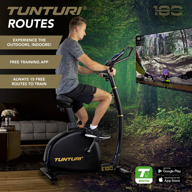 Rotoped TUNTURI Centuri E100 Hledáte další varianty? Chcete cvičit intenzivněji a s jasnými cíli? Cvičení na rotopedu E100 z řady Tunturi Centuri vám umožní vybrat si z různých programů s komplexními funkcemi a zpětnou vazbou. - 32 úrovní odporu, - 26 programů- Ergometrické cvičební kolo- Brzdný systém PMS / servomotor- Setrvačník 11 kg- Možnost připojení k systému Tunturi Routes- Limitovaná edice Centuri Limitovaná edice CenturiV roce 1922 otevřeli bratři Harkkeovi ve finském Turku obchod s jízdními koly Tunturi. V 60. letech jsme jako první na světě představili cvičné kolo s ergometrem. Rychlý posun vpřed do roku 2022: naše sté narozeniny. Na oslavu tohoto milníku jsme vyvinuli speciální řadu limitované edice výrobků Centuri v krásném zlato-černém stylu. Naše důvěryhodné výrobky Tunturi s elegantním, novým a limitovaným designem, který dobře ladí s ostatními výrobky Tunturi. Vydejte se na výlet do přírody s bezplatnou aplikací Tunturi RoutesStoupáte na Alpe d'Huez na kole? Svištíte na lyžích po sněhu v Alpách? S aplikací Tunturi Routes zůstává trénink zábavou a výzvou. Bezplatná verze aplikace poskytuje vždy přístup k patnácti videotrasám. S prémiovou verzí Tunturi Routes si můžete vybrat ze stovek tisíc kilometrů tras po celém světě a stovek tréninkových videí. Váš trénink bude skutečným vizuálním zážitkem! Odpor vašeho trenažéru Tunturi se automaticky synchronizuje s výškovými rozdíly ve videu, takže se zážitek stane ještě více zážitkovým. Monitor těla s umělou inteligencí (BAI) a BluetoothJasný přehled tréninkových dat, skóre Body Activity Index* a osobní tréninkový program v aplikaci iConsole+ na základě vašich výsledků. To je jen několik funkcí, které charakterizují monitor BAI. Jasná obrazovka je nakloněná pro optimální viditelnost i při silném odrazu a integrovaný modul Bluetooth umožňuje připojit trenažér přímo k aplikacím, jako jsou Tunturi Routes, Kinomap a Zwift. *Skóre indexu tělesné aktivity se vypočítává kombinací tepové frekvence, věku, pohlaví a délky tréninku. Měňte tréninkySe setrvačníkem o hmotnosti 11 kg (24,3 lbs) generujete maximální výkon 350 wattů. Vyberte si z 32 úrovní odporu nebo postupujte podle jednoho z 26 cvičebních programů. Určete si svůj cíl a přejděte na vlastní trénink: ergometr umožňuje zvyšovat výkon v 5wattových krocích. Tímto způsobem budete vždy trénovat na své vlastní úrovni. Bezpečný a stabilní tréninkModel E100 má bezpečný a nízký nástup. Díky tomu můžete cvičit bezpečně a zodpovědně, i když nemáte zkušenosti nebo jste omezeni v pohybu. Řemínky na ergonomicky tvarovaných protiskluzových pedálech jsou nastavitelné, takže vaše nohy zůstanou při šlapání stabilní. Zwift řízenýTento trenažér Tunturi je řízen systémem Zwift. To znamená, že se rychlost videa přizpůsobuje vašemu tempu. Kromě toho trenažér sleduje výškové rozdíly na videu a podle toho upravuje odpor. Parametry vašeho tréninku jsou také v reálném čase sdíleny se systémem Zwift, takže máte dobrý přehled o svém pokroku. Displej Velikost displeje: 5,5 palce Typ displeje: Barevné podsvícení LCD Celkem program: 26 Typy program: 1 rychlý start, 1 časový cíl, 1 cíl vzdálenosti, 1 kalorický cíl, 1 tělesný tuk/BMI, 1 watt, 4 programy srdeční frekvence, 4 uživatelské programy, 12 přednastavených programů Úrovně odporu: 32 Jazyky_ Angličtina Wattový program: 10 - 350 na 5 wattů Fitness test: Recovery Funkce displeje: BAI, čas, vzdálenost, kalorie, rychlost, úroveň, puls, otáčky za minutu, tréninkový profil, watt Brzdný system: PMS, servomotor Setrvačník: 11 kg Maximální odpor při 60 otáčkách za minute: 250 W Ergometr Napájení: Adaptér 9V/1A Pedály: Komfortní Rozměry v sestaveném stavu: D 99 x Š 60 x V 158 cm Hmotnost trenažéru: 38,7 kg Maximální hmotnost uživatele: 135 kg Kód produktu: 22CBE10000 EAN kód: 8717842034712 Rozměry krabice: L 119 x Š 28 x V 68 cm Hmotnost krabice: 42,2 kg Nastavitelný monitor Řídítka: Multigrip (nastavitelná, plynulá) Sedlo: Comfort Nastavení sedla: Horizontální / vertikální Tepová frekvence prostřednictvím sluchátek Analogové připojení hrudního pásu (5 - 5,4 khz) Připojení hrudního pásu přes Bluetooth Držák na láhev Přepravní kolečka Bluetooth Nabíječka USB Aplikace: (Android/iOS)Tunturi Routes, Kinomap, Zwift controlled, iConsole+ Training Držák tabletu Použití: domácí,