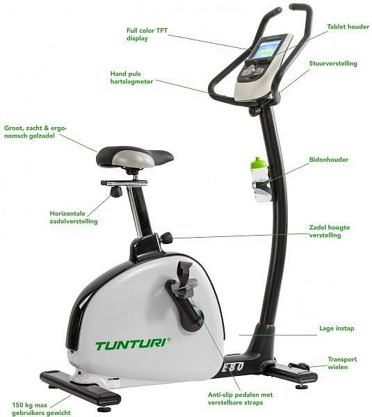 Rotoped je vybaven pohodlným plně nastavitelným sedlem, které je možné upravit jak vertikálně, tak i horizontálně. Sedlo si lehce nastavíte přímo na míru a navíc si můžete přizpůsobit i sklon řídítek, což zajistí pohodlný trénink osobám různé výšky. Plastové pedály opatřené fixačními řemínky (klipsnami) drží bezpečně chodidlo na šlapačce. Předností modelu TUNTURI E80 Bike Endurance je nízký práh při nastupování a sestupování vhodný pro osoby se zdravotním hendikepem.