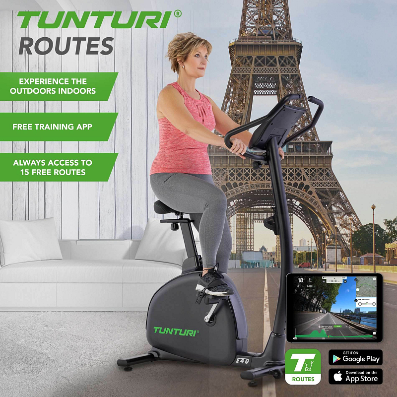 Trénujete často uvnitř a nudí vás ulice nebo zeď? Pak přidejte do svého tréninku další vizuální výzvu! Zařízení E40 se připojuje přes Bluetooth k aplikacím, jako jsou Tunturi Routes nebo Zwift. S aplikací Tunturi Routes proměníte svůj trénink ve vizuální zážitek. Vyšplhejte na Alpe d'Huez nebo si vyberte vyhlídkovou trasu po vesnicích a lesích. S bezplatnou verzí aplikace máte k dispozici vždy 15 videí tras, placená verze nabízí stovky tras. Zařízení E40 je navíc kompatibilní se systémem Zwift, což znamená, že se video přizpůsobuje tempu, kterým jezdíte na kole.