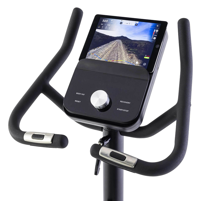 Na 7palcovém displeji vidíte všechny parametry na první pohled. Monitor snadno nakloníte rukou, takže je vždy ve správné poloze pro jasný výhled na obrazovku, ať už jedete na kole vzpřímeně, nebo v závodním režimu. Pomocí rozhraní Bluetooth připojíte trenažér ke snímači srdečního tepu nebo k aplikacím Tunturi Routes a Zwift a získáte tak vizuální tréninkový zážitek. Chcete tréninkový program zcela na míru? Technologie umělé inteligence vám prostřednictvím aplikace iConsole+ umožní nechat si sestavit osobní tréninkový program na základě vašich tréninkových výsledků. Při umístění tabletu nejsou 4 hlavní parametry blokovány z dohledu.