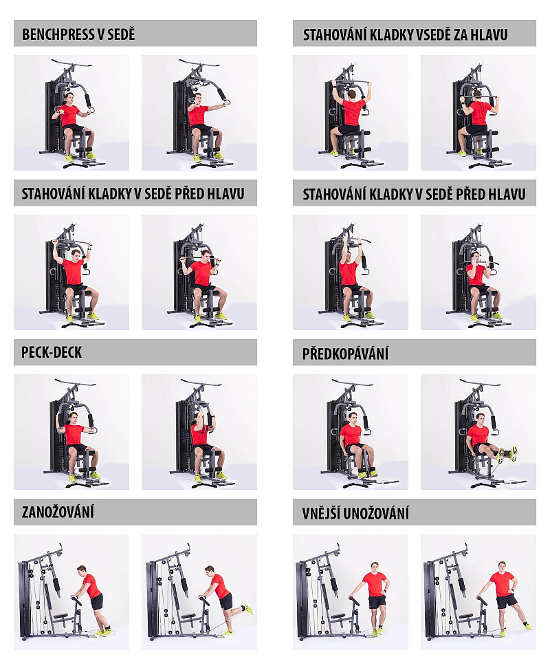 Disponuje multifunkčním polohovatelným adaptérem na tlaky v sedě, peck-deckem, bicepsovou opěrku a dalšími cviky (4 polohy).