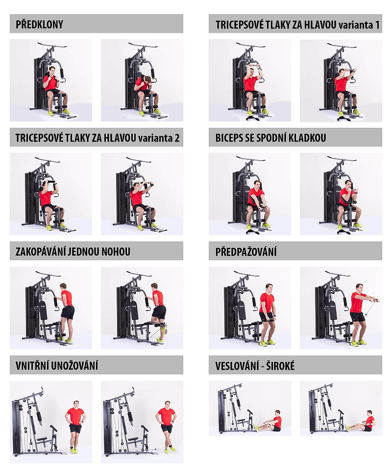 universální posilovací věž s výborným poměrem kvality, komfortu cvičení a ceny široké možnosti individuálního nastavení desítky cviků na celé tělo, bicepsová opěrka kladky s kuličkovými ložisky nosnost 130 kg, sada závaží 78 kg záruka 3 + 5 let, servis doma