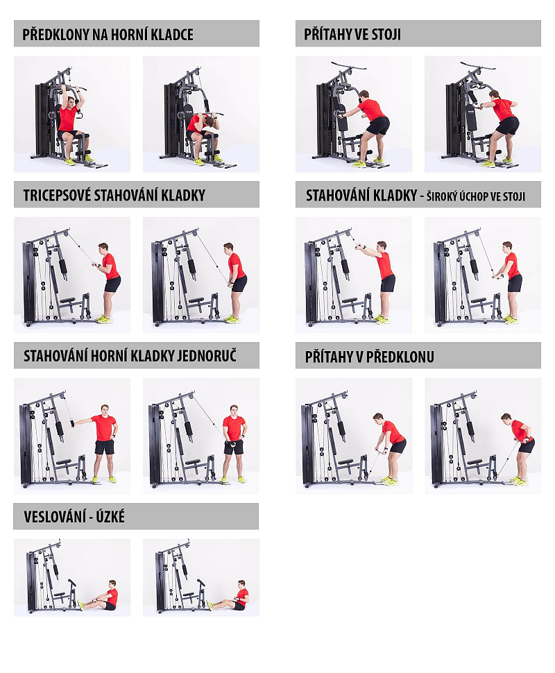 • Horní kladka slouží ke stahování kladky shora na posílení zádových svalů, či tricepsu s možností fixace nohou o pěnové zarážky na kolena
