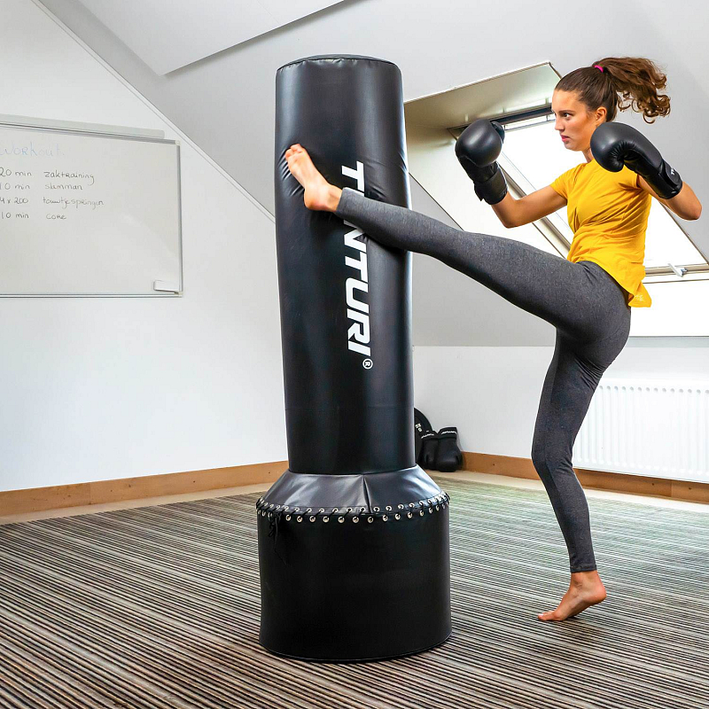 Noha tohoto boxovacího pytle pojme přibližně devadesát kilogramů písku. Díky této hmotnosti je boxovací pytel pevný a stabilní, ať už udeříte nebo kopnete jakkoli silně. Samotný pytel je vyroben z PVC. Tento materiál má velkou absorpční schopnost, což znamená, že údery a kopy méně zatěžují vaše klouby. Kromě toho PVC snadno pruží, takže boxovací pytel na stání si udržuje svůj tvar.