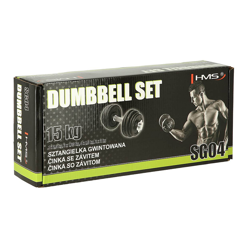 HMS SG04 označuje nakládací činku, které nesmí chybět v žádné domácí posilovně. Osa nakládací činky má délku 35 centimetrů. Nakládací část je opatřena závitem a její průměr je 30 milimetrů. Naložená závaží se zajišťují maticí, která je opatřena gumovým proužkem, který po dotažení zamezuje povolování matice. Úcop činky je drážkovaný. Kotouče jsou vyrobeny z litiny. Parametry: Délka osy: 35 cm Průměr nakládací části a úchopu: 30 mm Sada obsahuje: osa - 1 kus matice - 2 kusy 1,25 kg závaží - 2 kusy 1,5 kg závaží - 4 kusy 2 kg závaží - 2 kusy Hmotnost sady: 15 kg Upozornění: Certifikát, norma: Záruka 24 měsíců