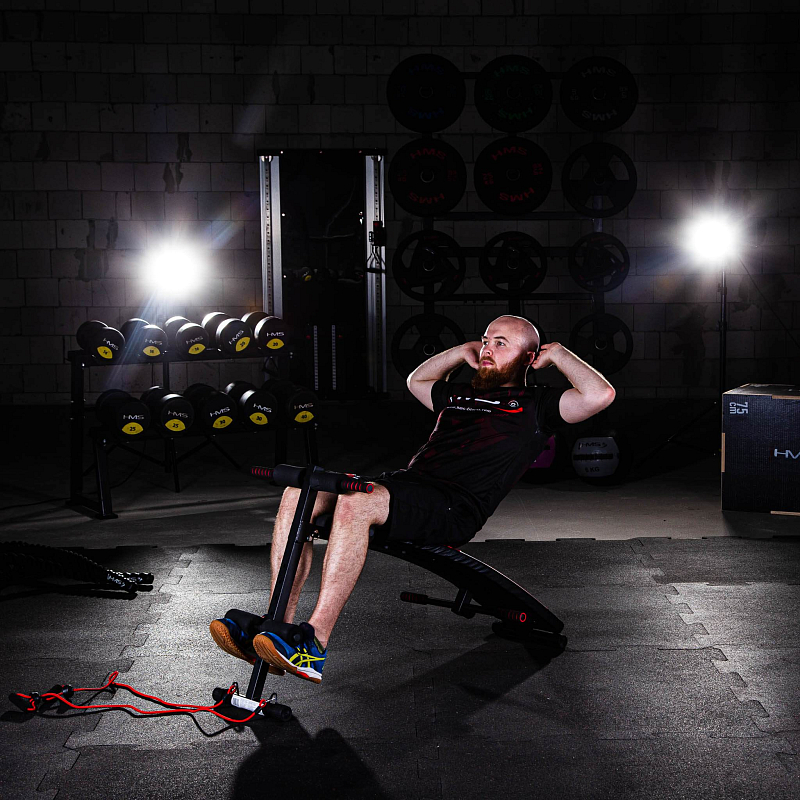 Šikmá lavička se závažím určena pro domácí použití. Je určena k tréninku břišních svalů, boků a páteře. Díky vinylovým činkám může uživatel provádět trénink horní poloviny těla.