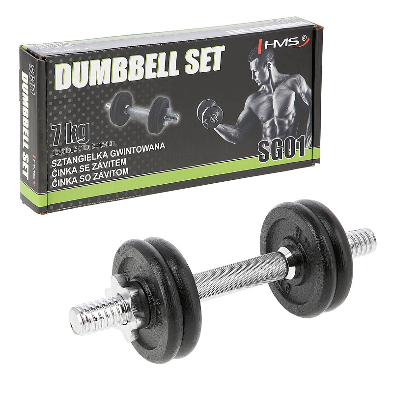 HMS SG01 označuje nakládací činku, které nesmí chybět v žádné domácí posilovně. Osa nakládací činky má délku 35 centimetrů. Nakládací část je opatřena závitem a její průměr je 30 milimetrů. Naložená závaží se zajišťují maticí, která je opatřena gumovým proužkem, který po dotažení zamezuje povolování matice. Úcop činky je drážkovaný. Kotouče jsou vyrobeny z litiny. Parametry: Délka osy: 35 cm Průměr nakládací části a úchopu: 30 mm Sada obsahuje: osa - 1 kus matice - 2 kusy 1 kg závaží - 2 kusy 1,25 kg závaží - 2 kusy Hmotnost sady: 7 kg Upozornění: Certifikát, norma: Záruka 24 měsíců