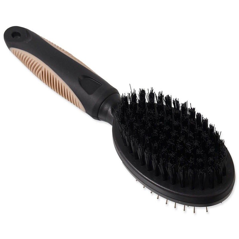 Oboustranný plastový kartáč pro všechna plemena psů. Strana s nylonovými štětinami pomáhá účinně odstraňovat nečistoty a uvolněnou srst. Drátěné štětiny s kuličkami na koncích pomáhají pak rovnoměrnému včesávání přírodních olejů.