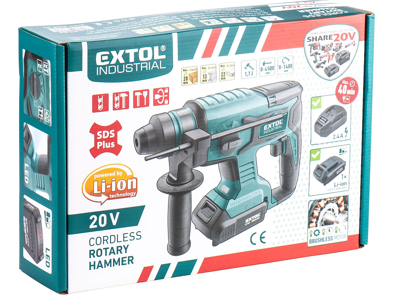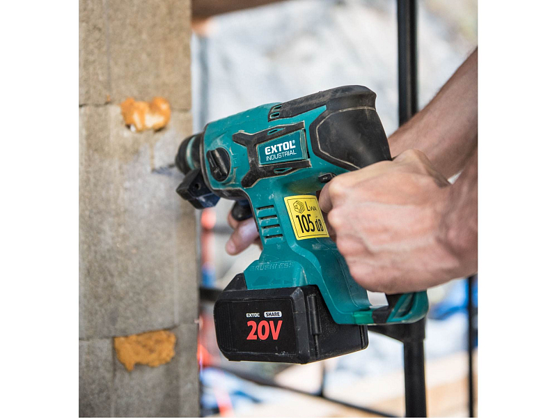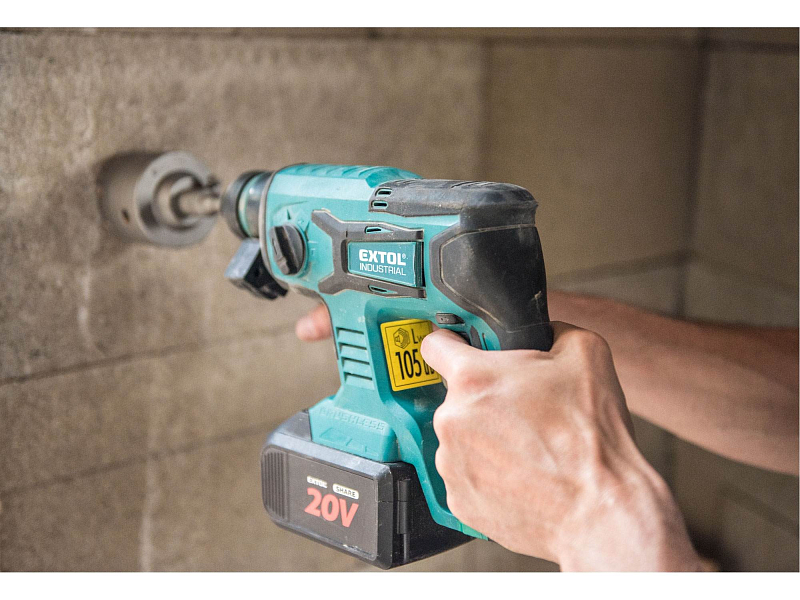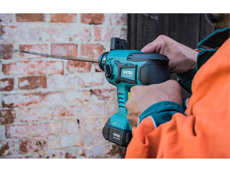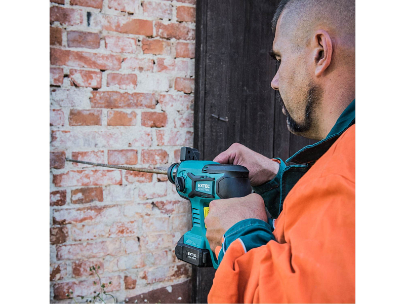 Aku vrtací kladivo je určeno k rychlému vrtání do cihel a betonu pomocí vrtáků s SDS plus stopkou a menším sekacím pracem. Kladivo je poháněno nejmodernějším „brushless" motorem. Tento nový typ motoru má vyšší životnost, je výkonnější a má menší spotřebu el. energie než klasické motory s uhlíkovými kartáči. Díky pneumatickému příklepovému systému je schopno vrtat mnohem rychleji a efektivněji než příklepové vrtačky. Kladivo má zámek sekáče, takže si můžete před sekáním sekáč nastavit do patřičné polohy a při sekání bude kladivo udržovat sekáč v této poloze. Jeho hlavní výhodou je akumulátorový pohon, který dovoluje si vzít kladivo s sebou tam kde s ním potřebujete pracovat, bez ohledu na to, jestli tam je rozvod elektrické energie. Kladivo je vybaveno zpětným chodem pro snadné vytažení zaseklého vrtáku a regulací rychlosti, kterou lze využít dle vrtaného materiálu. Integrované LED osvětlení má zpožděné vypnutí a svítí ještě několik vteřin po vypnutí kladiva. Pro běžnou práci dostačují jeden nebo dva 2000mAh akumulátory, které můžete rychle nabít v rychlonabíječce, pro náročnější nebo delší práci doporučujeme větší akumulátory s kapacitou 4000–8000mAh. Akumulátor lze použít ve všech typech nářadí řady EXTOL SHARE20V. Díky použité Li-ion technologii je ho možné kdykoliv dobíjet,…