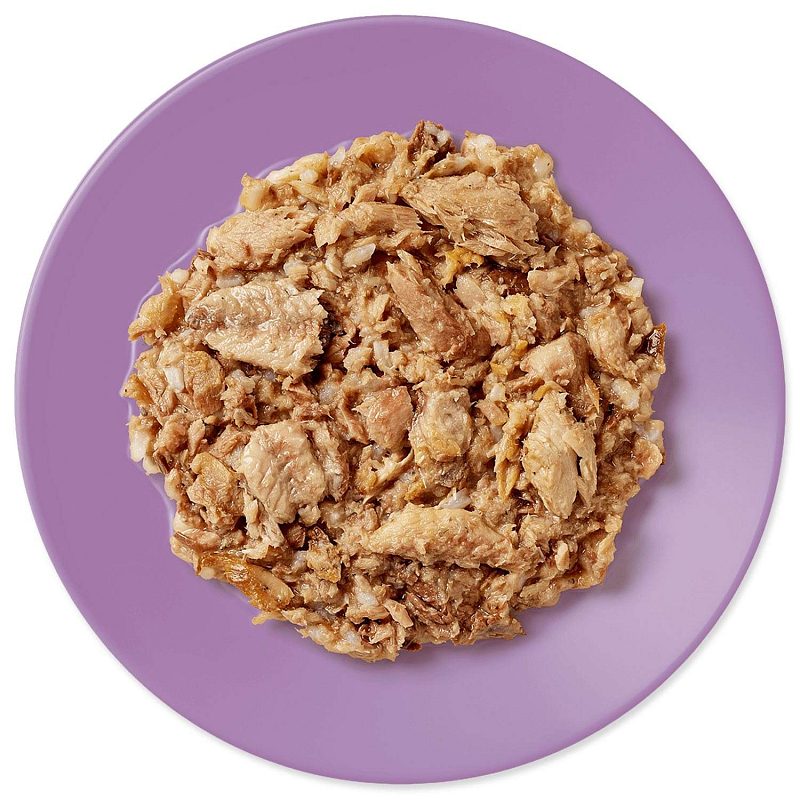 Ryby a výrobky z ryb (makrela 70%, sardinky 5%), rybí vývar 24%, rýže 1%.