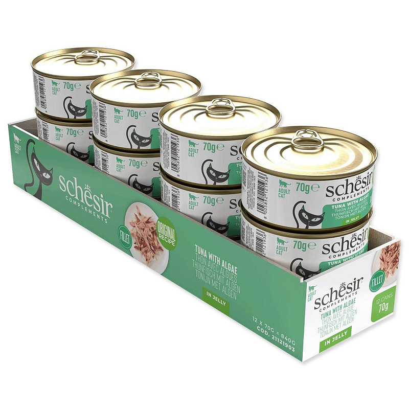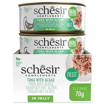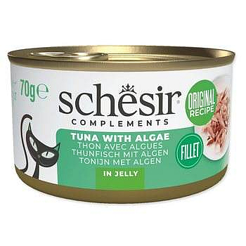 Pravé dušené filety z tuňáka s mořskou řasou v želé – přirozená a neodolatelná kombinace. Dopřejte své kočce Schesir Complements v želé, vynikající krmivo speciálně vyvinuté pro dospělé kočky. Tuňák ulovený na volném moři. Jednoduché, přírodní suroviny. Bez zbytečných přísad. Vysoký obsah bílkovin a nízký obsah sacharidů pro podporu svalů a vitality. Jemné želé pomáhá doplňovat tekutiny a zvyšovat hydrataci. Receptura je bohatá na vitaminy, minerály a taurin. Přirozenou chuť a živiny zachovává šetrné vaření v páře. Lze dobře kombinovat s kompletním suchým krmivem. Složení: Tuňák (51 %), rýže (1,5 %), řasy [Porphyra spp] (0,02 %). Analytické složky: Hrubý protein 12 %, hrubý tuk 0,2 %, hrubá vláknina 0,1 %, hrubý popel 0,8 %. Vlhkost 86 %. Podávejte až 2 konzervy denně, spolu s kompletním suchým krmivem. Vždy poskytněte zvířeti přístup k čerstvé, pitné vodě. Podávejte při pokojové teplotě. Po otevření skladujte v chladničce a spotřebujte do 48 hodin. Vyrobeno v Thajsku.