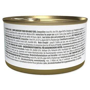 | Složení: | Tuňák (51 %), rýže (1,5 %), řasy [Porphyra spp] (0,02 %). |