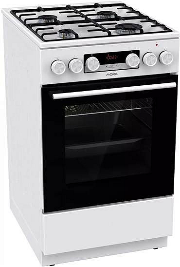 Kombinovaný sporák s multifunkční troubou, bílá barva, 4 plynové hořáky s pojistkami STOP GAS, vlevo vpředu O 5,4 cm, 1 kW, vpravo vpředu O 9,9 cm, 3 kW, vlevo vzadu O 7,4 cm, 1,9 kW, vpravo vzadu O 7,4 cm, 1,9 kW, SMALTOVANÁ dvoudílná mřížka STABIL PLUS, INTEGROVANÉ zapalování hořáků, DIGITÁLNÍ dotykový časový spínač s hodinami, programování doby pečení, multifunkční trouba – 11 způsobů ohřevu, rychlý předehřev trouby, program PIZZA, program pro HOTOVÁ A MRAŽENÁ JÍDLA, program HORKOVZDUŠNÉ FRIT