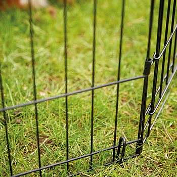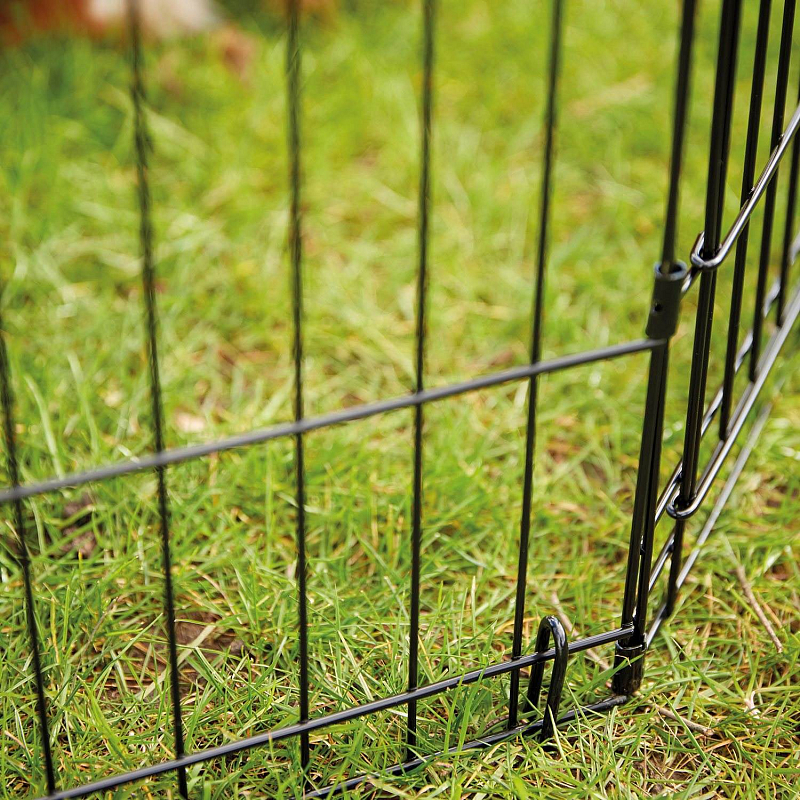 Kovová ohrádka z 8 dílů s dvířky. Velikost každého dílu: šířka 61, výška 61 cm.