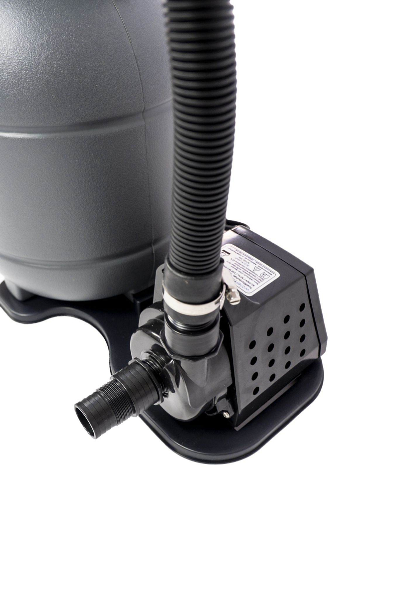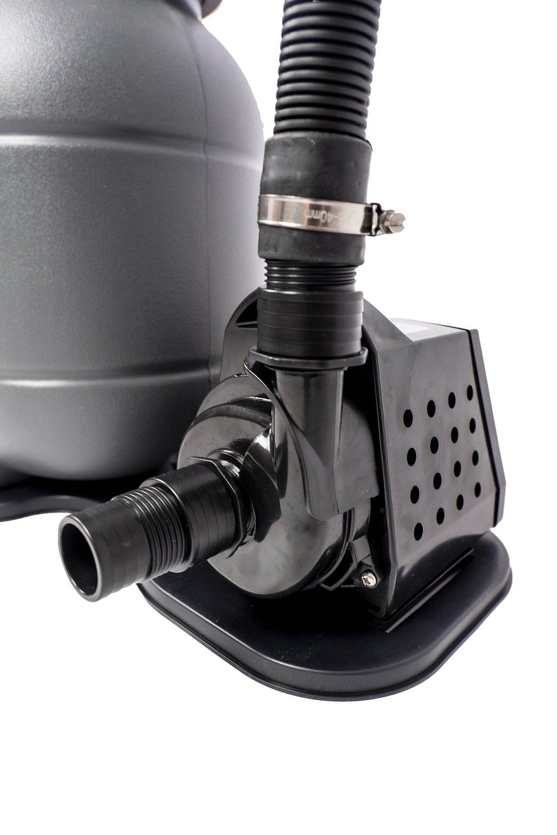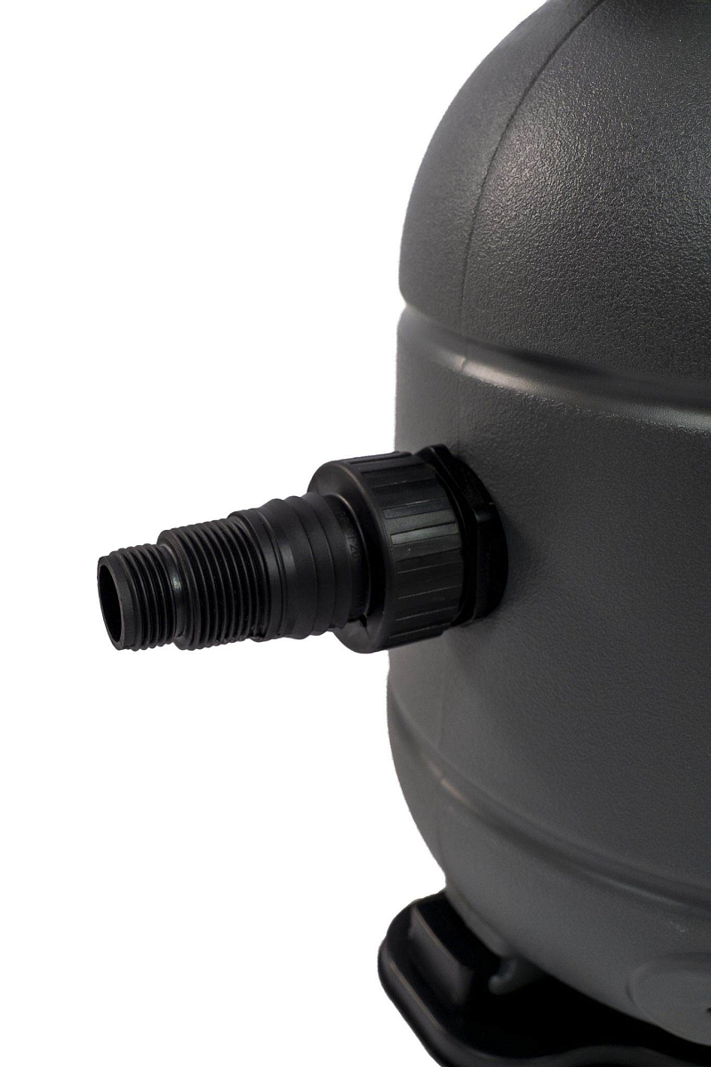 Filtrační nádoba je vyrobena z odolného polypropylenu, který nepodléhá korozi, odolává UV záření i běžné bazénové chemii. Stabilní základna s otočným zámkem zajišťuje bezpečné uchycení filtrační nádoby a dlouhou životnost celého systému.