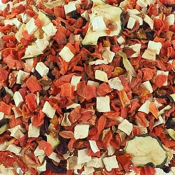 Složení: sušená mrkev 50 %, sušený pastinák 20 %, sušená červená řepa 10 %, sušená rajčata 10 %, sušená cuketa 5 %, sušená dýně 5 %.