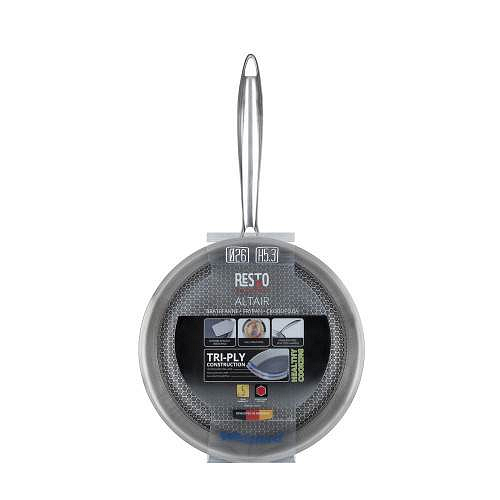 TRI-PLY (nerezová ocel 18/10 + hliník), Protiskluzový voštinový vzor s nepřilnavým povrchem, Nerezová ocelová rukojeť, Úspora energie až 25%, Vhodné pro všechny typy súporáků, Vhodné do myčky, Vhodné do trouby až do 220°?, Materiál: tři vrstvy z nerezi a hliníku, Průměr: 26 cm, Hloubka: 5,3 cm