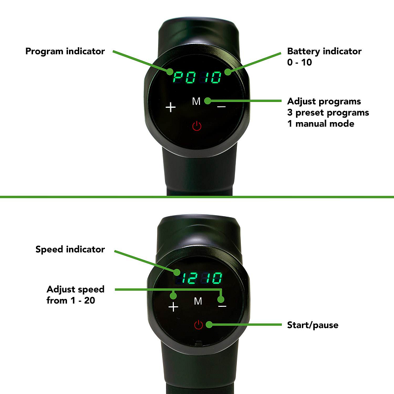 Dotykový displej LED na přístroji usnadňuje volbu rychlosti a také ukazuje zbývající energii baterie. Výkonná lithiová baterie má výdrž pět až jedenáct hodin v závislosti na použité rychlosti masáže. K dispozici jsou tři přednastavené programy a manuální režim. Přístroj je lehký a můžete jej přenášet v praktickém pouzdře. S hlučností pouhých 50-60 db je tento přístroj při používání tichý.