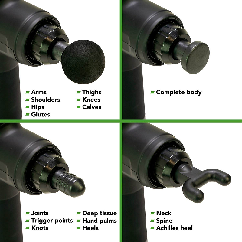 Masážní pistole má dvacet různých možností rychlosti od 1200 do maximálních 3300 otáček za minutu. Lze ji použít pro všechny typy masáží, od povrchové masáže až po masáže, které zasahují do hlubších svalových partií. Dodává se se čtyřmi hlavicemi: kulovou, vidlicovou, kulovou a plochou. Pomocí těchto čtyř hlavic můžete masírovat všechny různé části těla a svalové skupiny.