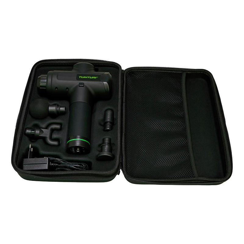 TUNTURI MG50 MASÁŽNÍ PISTOLE Masážní pistole Tunturi je skvělým partnerem pro zahřátí svalů před tréninkem nebo po něm pro snížení bolesti a napětí v těle. Profesionální masážní přístroj stimuluje krevní oběh a pomáhá urychlit regeneraci svalů.- Snižuje stres, bolest a svalové napětí- Stimuluje krevní oběh- S 20 různými možnostmi rychlosti- 4 masážní hlavice- 3 programy- Tichý provoz Ideální partner pro masáž Masážní pistole MG50 je skvělým partnerem pro zahřátí svalů před tréninkem nebo po něm pro snížení bolesti a napětí v těle. Profesionální masážní přístroj stimuluje krevní oběh a pomáhá urychlit regeneraci svalů. Masážní pistole je však také ideálním partnerem pro celkovou relaxaci a snížení stresu v těle i mysli. Různé účely Masážní pistole má dvacet různých možností rychlosti od 1200 do maximálních 3300 otáček za minutu. Lze ji použít pro všechny typy masáží, od povrchové masáže až po masáže, které zasahují do hlubších svalových partií. Dodává se se čtyřmi hlavicemi: kulovou, vidlicovou, kulovou a plochou. Pomocí těchto čtyř hlavic můžete masírovat všechny různé části těla a svalové skupiny. Jednoduché a tiché Dotykový displej LED na přístroji usnadňuje volbu rychlosti a také ukazuje zbývající energii baterie. Výkonná lithiová baterie má výdrž pět až jedenáct hodin v závislosti na použité rychlosti masáže. K dispozici jsou tři přednastavené programy a manuální režim. Přístroj je lehký a můžete jej přenášet v praktickém pouzdře. S hlučností pouhých 50-60 db je tento přístroj při používání tichý.Tento držák na činky je ideálním řešením pro bezpečné zavěšení ohlávek na zeď. Už žádné halapartny se nebudou povalovat, místo toho budou všechny úhledně uloženy ve stojanu u zdi. Stojan můžete zavěsit v preferované výšce pomocí jednoduchého upevňovacího systému. Specifikace: ○ Velikost: L 23 x W 7 x H 24.5 cm ○ Hmotnost: 1360 gramů ○ Materiál: ABS ○ Barva: černá a zelená ○ Počet možností rychlosti: 20 ○ Počet hlavic: 4 ○ LED dotyková obrazovka ○ RPM: 1200 – 3300 ○ Výdrž baterie: 5 – 11 hodin ○ Motor: 20W, 50-60 db ○ Kód produktu: 14TUSYO059 ○ EAN kód: 8717842033005